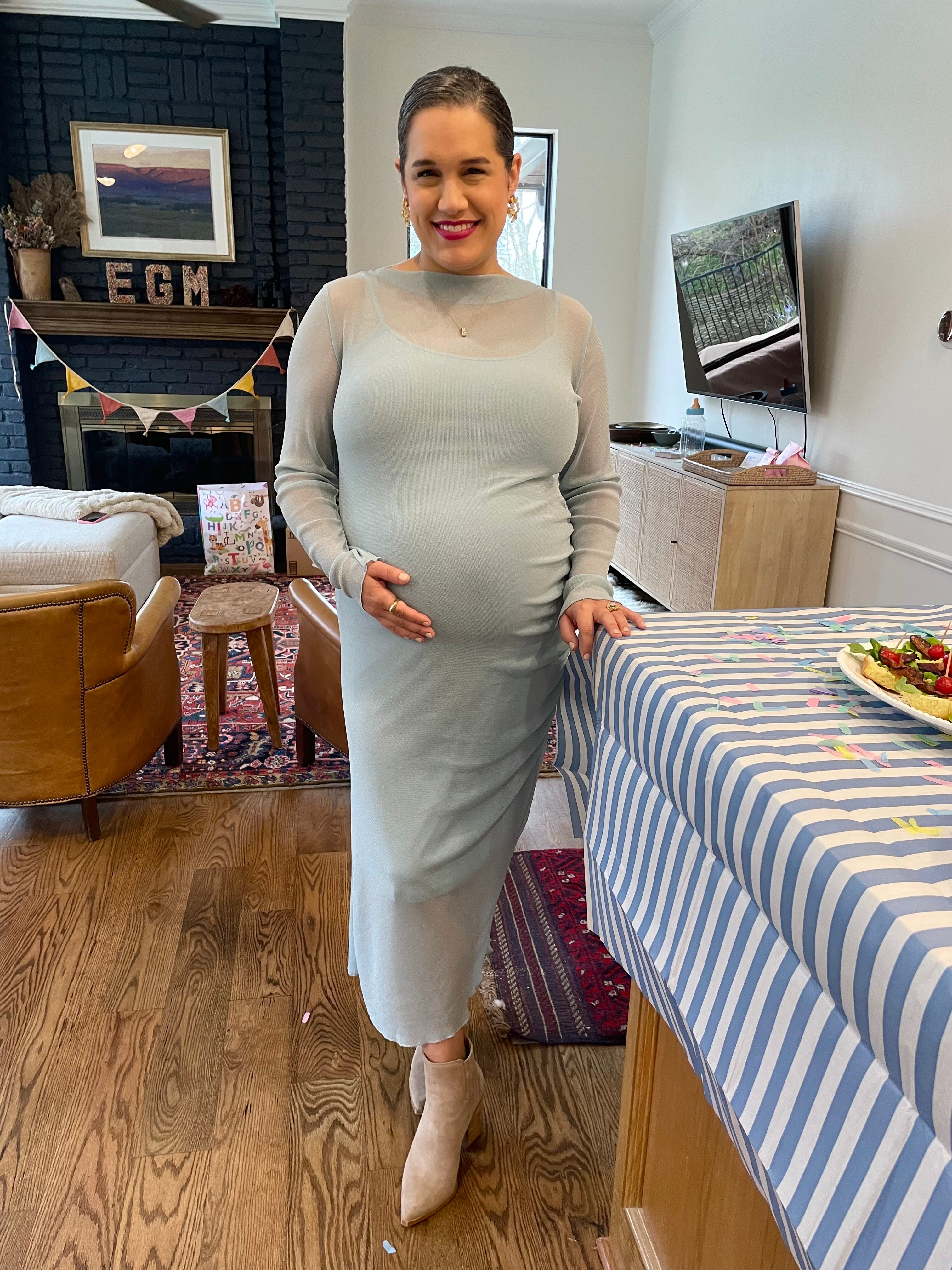 This is the powder blue dress I wore to my baby sprinkle last weekend. For Ziggy’s baby shower, I wore a shapeless comfy dress, so I wanted to go the opposite direction this time and wear something fancier and more form-fitting even though the occasion itself was extremely casual. I felt gorgeous, and that’s what matters.