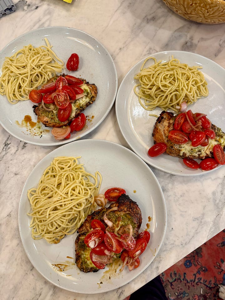The second, more elaborate meal I made was this caprese grilled chicken with lightly dressed pesto noodles. I’d made it once before and remembered how filling and fresh it was, and I’m pleased to say my memory served me well.