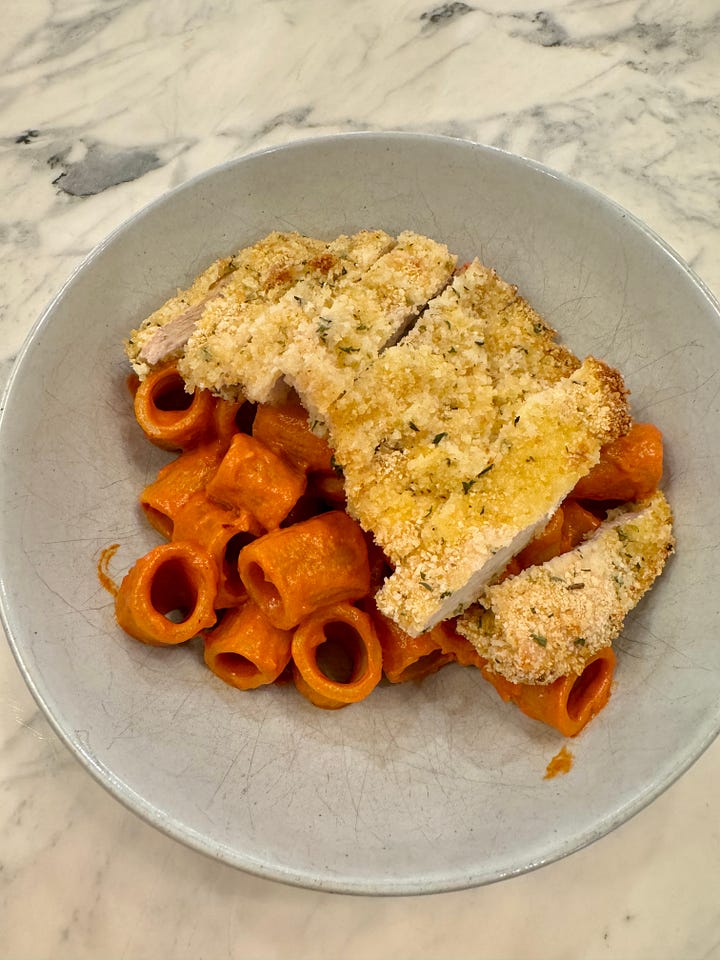 The THIRD meal I made in this house was Caroline Chambers’ Vodka Sauce, which I paired with this breaded chicken recipe that was FUCKING AWESOME. It was such a good meal, and the chicken was exceptionally good.