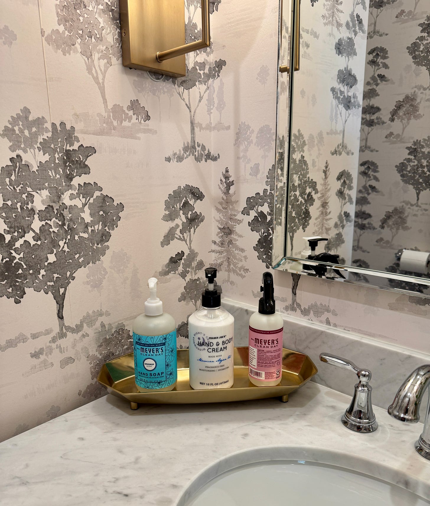 In every bathroom of this home, I have these three products lined up on a vanity tray. All bathrooms have this rattan tray with a matching waste basket (both from Target, so cute) except for one, which has this brass vanity tray because it just made more sense in this one particular bathroom. GIVE ME ALL THE TRAYS!